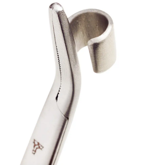 Die gebogenen Backen und die goldfarbene Schlaufe sorgen für präzises Arbeiten und gute Handhabung – auch bei kalten Fingern oder schwierigen Lichtverhältnissen.